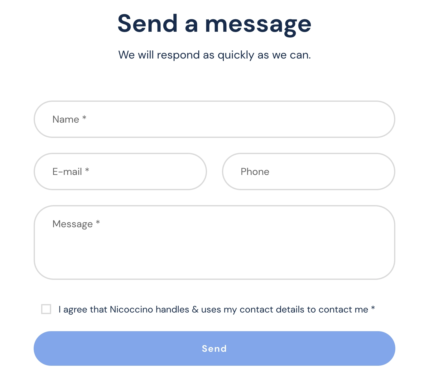 Titel – Ange formulärets titel. Detta motsvarar ”Send a message” på Nicoccinos formulär.